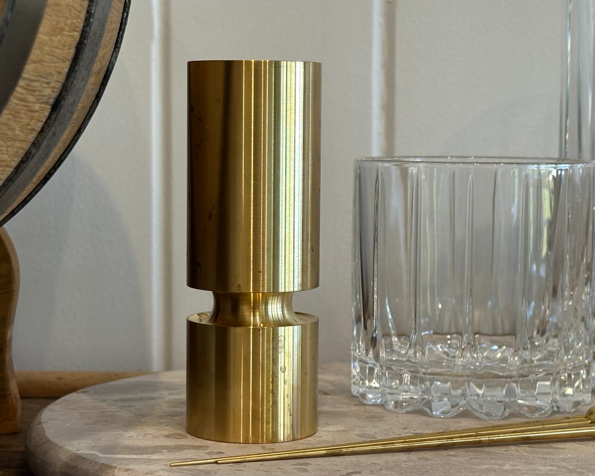 This solid brass spirit measure by Exhibit A is a beautiful piece that doubles as both a single and double serve and a bottle opener.