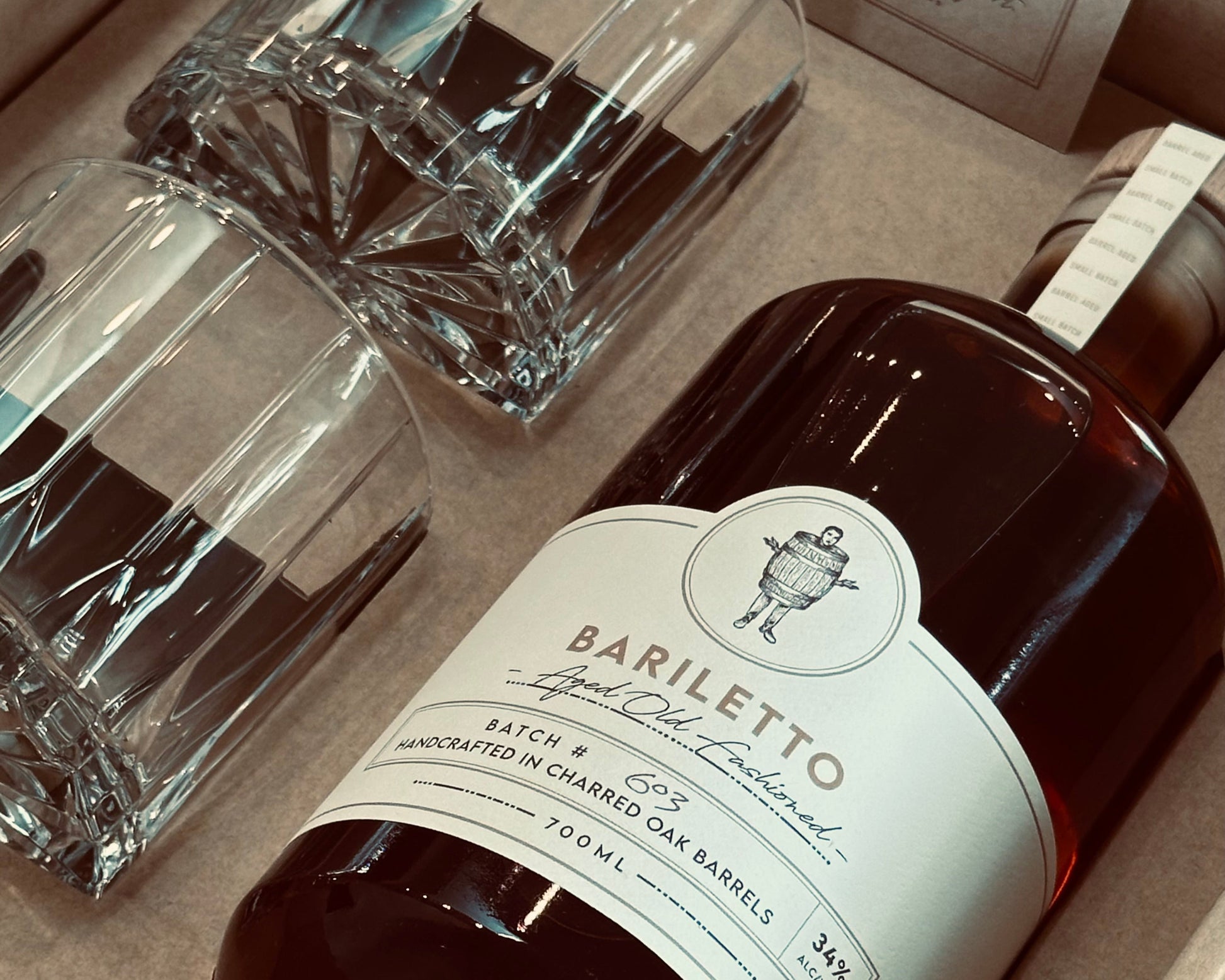 A bottle of barrel aged Old Fashioned and 2 Riedel crystal glasses packaged ready for the perfect gift.